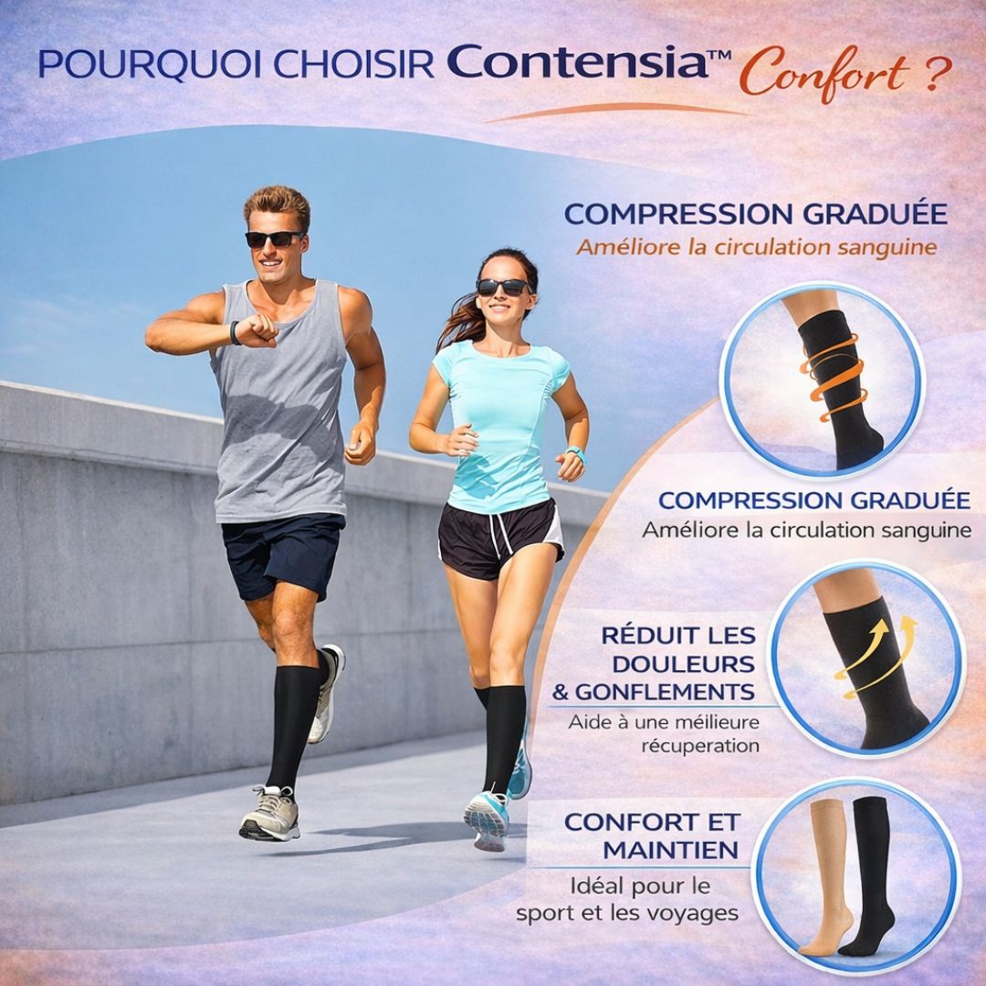 Faciles à enfiler et agréables à porter, les chaussettes CONTENSIA™ Confort agissent immédiatement pour améliorer la circulation et réduire la fatigue, sans routine compliquée.